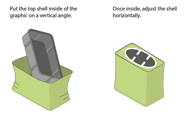 Start by putting the small hard case shell in first vertically so its fits through the hole, once inside adjust horizontally to the correct position. Push it as far in and then loosely connect the Velcro tabs. Now the larger shell (Which will become the top of the podium), put this through the graphic opening hole vertically as well and then adjust it horizontally. At this point push the support poles in and asset up between the shells. Now you can connect the top Velcro tabs before placing the countertop in place.